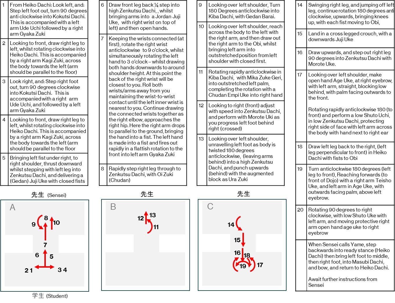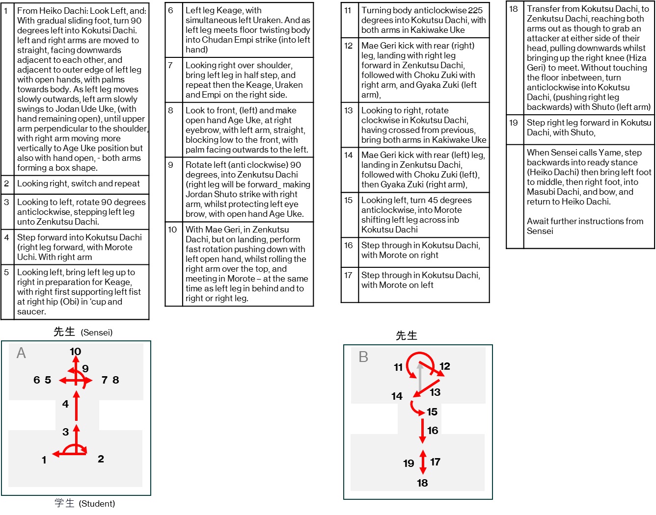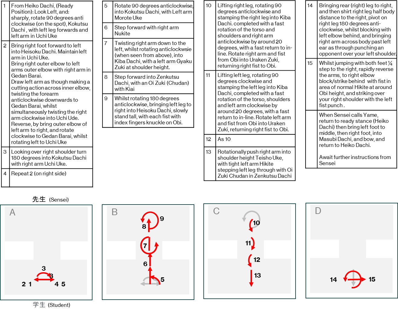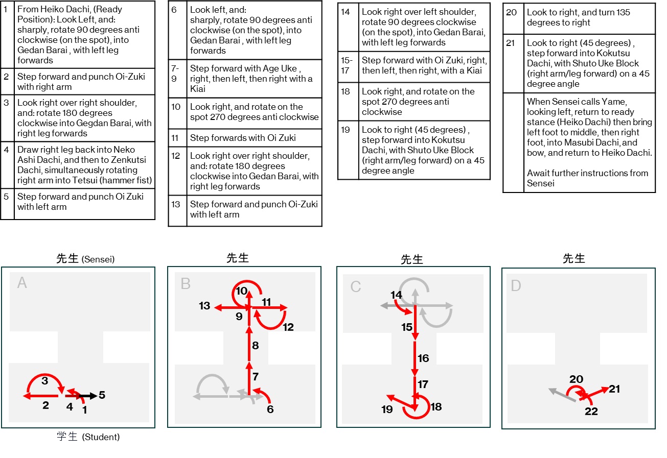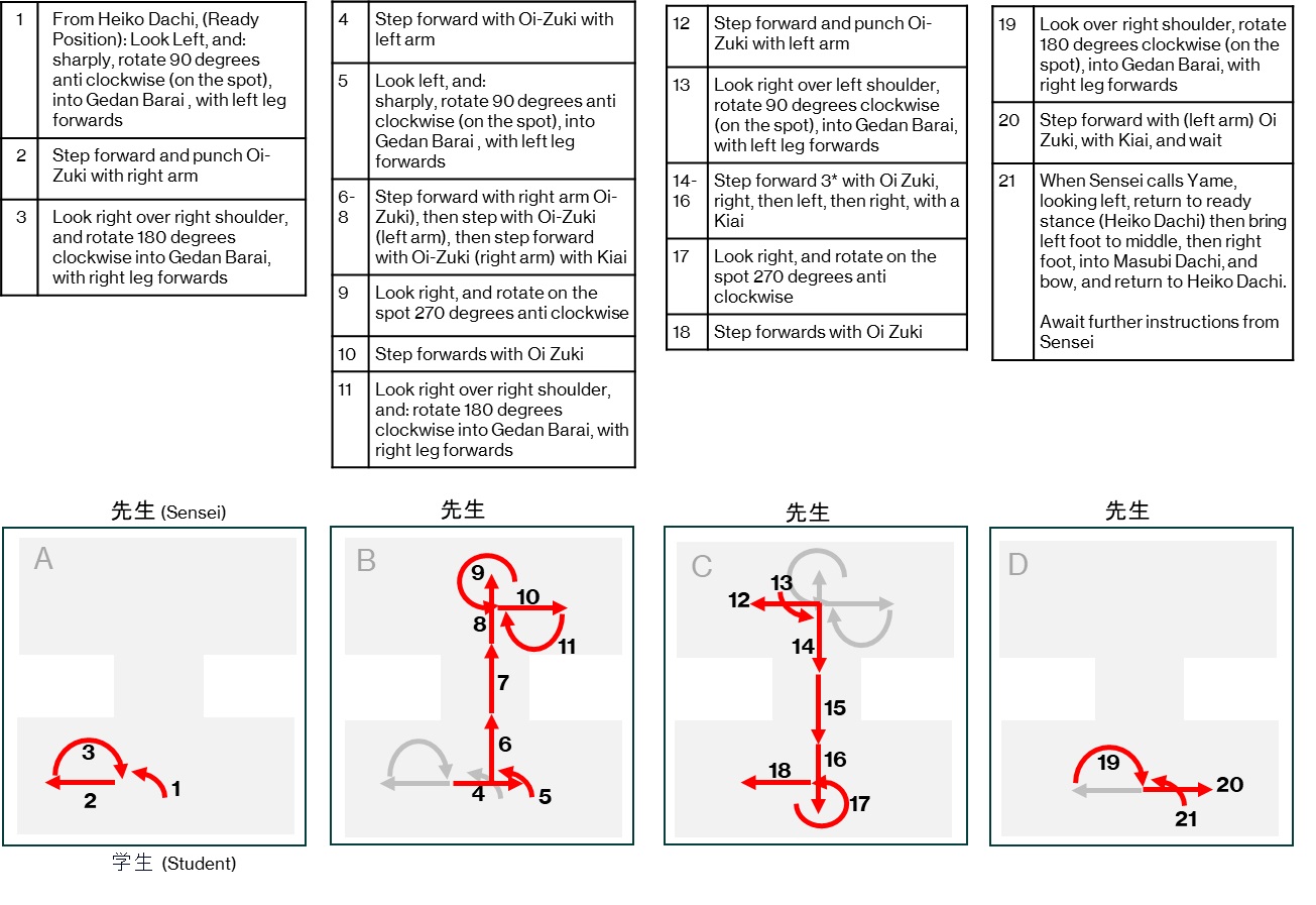 Learning the direction of the kata, is the first achievement, followed by refining and linking techniques and improved by applying speed, power and spirit (Kime). Everyone can improve in every Kata, and even the simpler Katas, provide us a focus in which to constantly review, reflect and reappraise our practice. The descriptors below give the basic direction of the Katas, but there is much detail in the positioning of hands, arms and feet, heights, and the pace at which different elements are to be performed.
