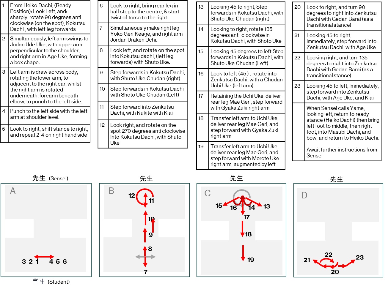 A Kata is a set of interlinked stances and techniques that enable practice, and which demonstrate understanding in competition and in gradings. Katas may be performed individually, in formation with others and in side by side competition.